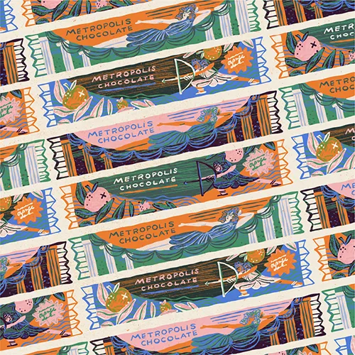 A series of layers describes my process. My design process often begins with an inky drawing, painting, or cut paper, whether traditionally or digitally, before moving onto Photoshop or Illustrator, where I add colour, patterns, and hand-painted textures.